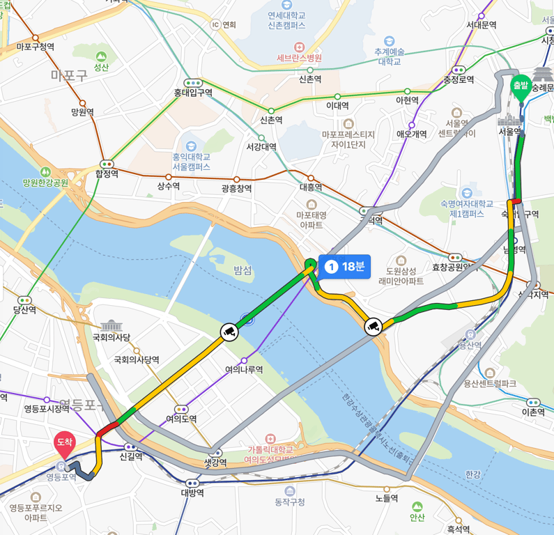 다음의 그림은 서울역에서 영등포역까지 가는 최단 경로를 보여준다. 여기 경로상에 있는 임의의 두 지점을 선택할 경우, 이 두 지점의 최단 이동 거리는 처음에 구한 전체 최단 경로를 따라 이동함으로써 구할 수 있다.