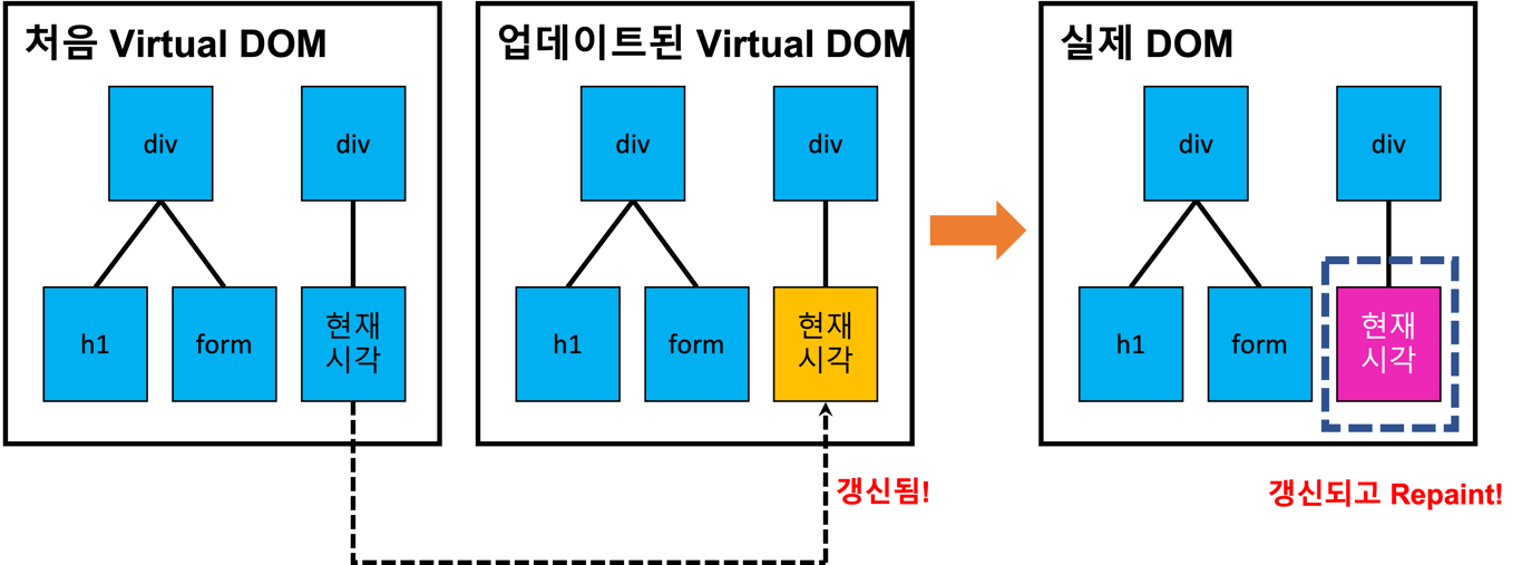 새로운 Virtual DOM을 생성하고 이전 Virtual DOM과 비교하여 변경된 부분만 실제 DOM에 반영한다. 이 과정을 재조정(Reconciliation)이라고 한다. 재조정 과정 후에는 리액트는 ReactDOM 라이브러리를 통해 실제 DOM을 업데이트한다. ReactDOM 라이브러리는 업데이트된 특정 노드를 타겟팅해서 실제 DOM를 Repainting한다.