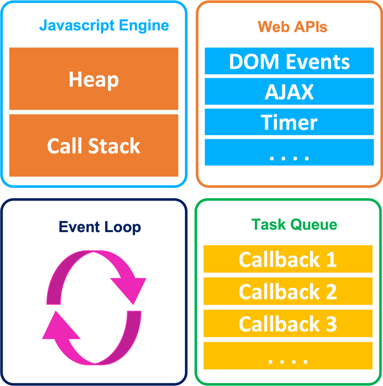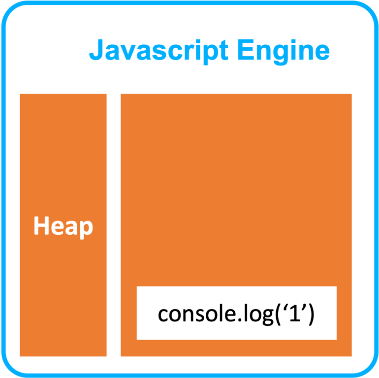 자바스크립트 엔진은 싱글 쓰레드로 동작한다. 그리고 쓰레드답게 스택과 힙이라는 자료구조를 가지고 있다. 이것을 각각 콜 스택, 힙이라고 부른다. 호출된 함수는 콜 스택에 쌓이고, 함수 내부에서 사용되는 변수는 힙에 할당된다. 그리고 비동기 작업의 경우는 Web APIs에게 위임한다.