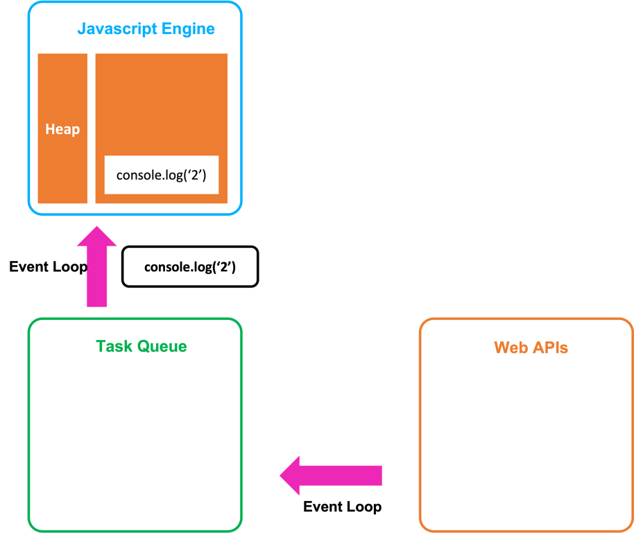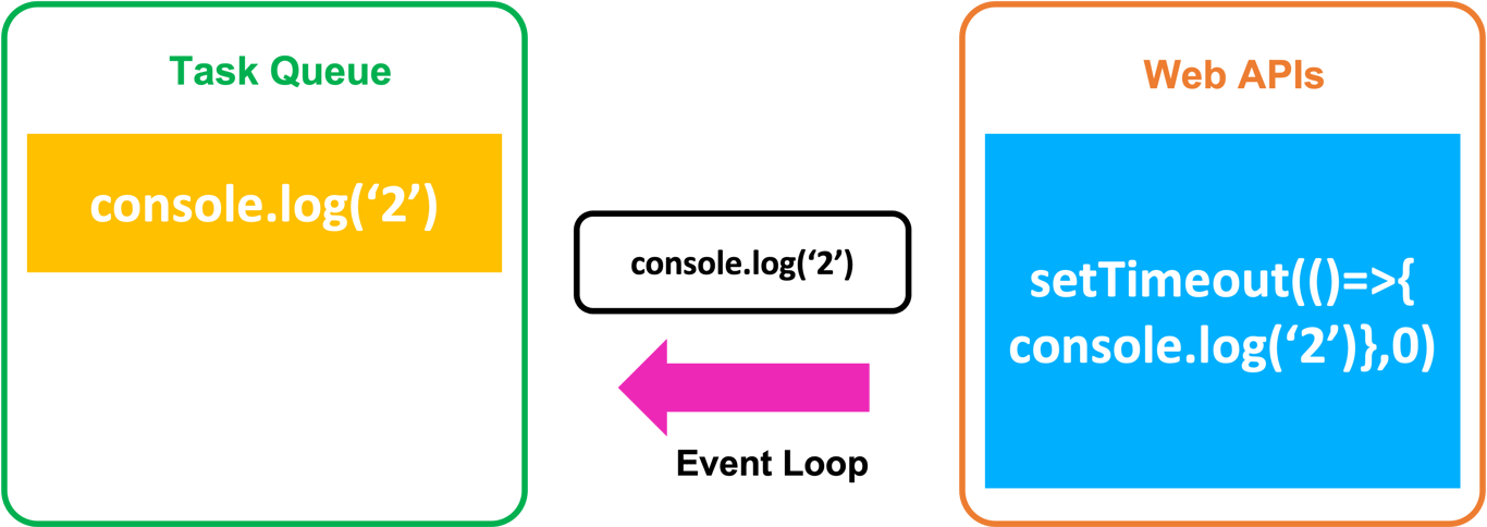 이벤트 루프로 인해 Web APIs로 위임한 setTimeout의 콜백 함수가 태스크 큐에 들어간다.