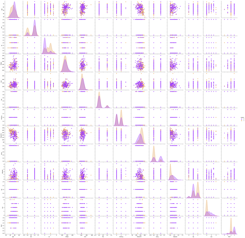 sns.pairplot(df,hue='output',palette = ["#8000ff","#da8829"])