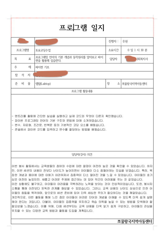 수업일지를 폴더에 저장해놨는데, 그 중에서 첫 수업일지를 발췌해서 올려보겠다.